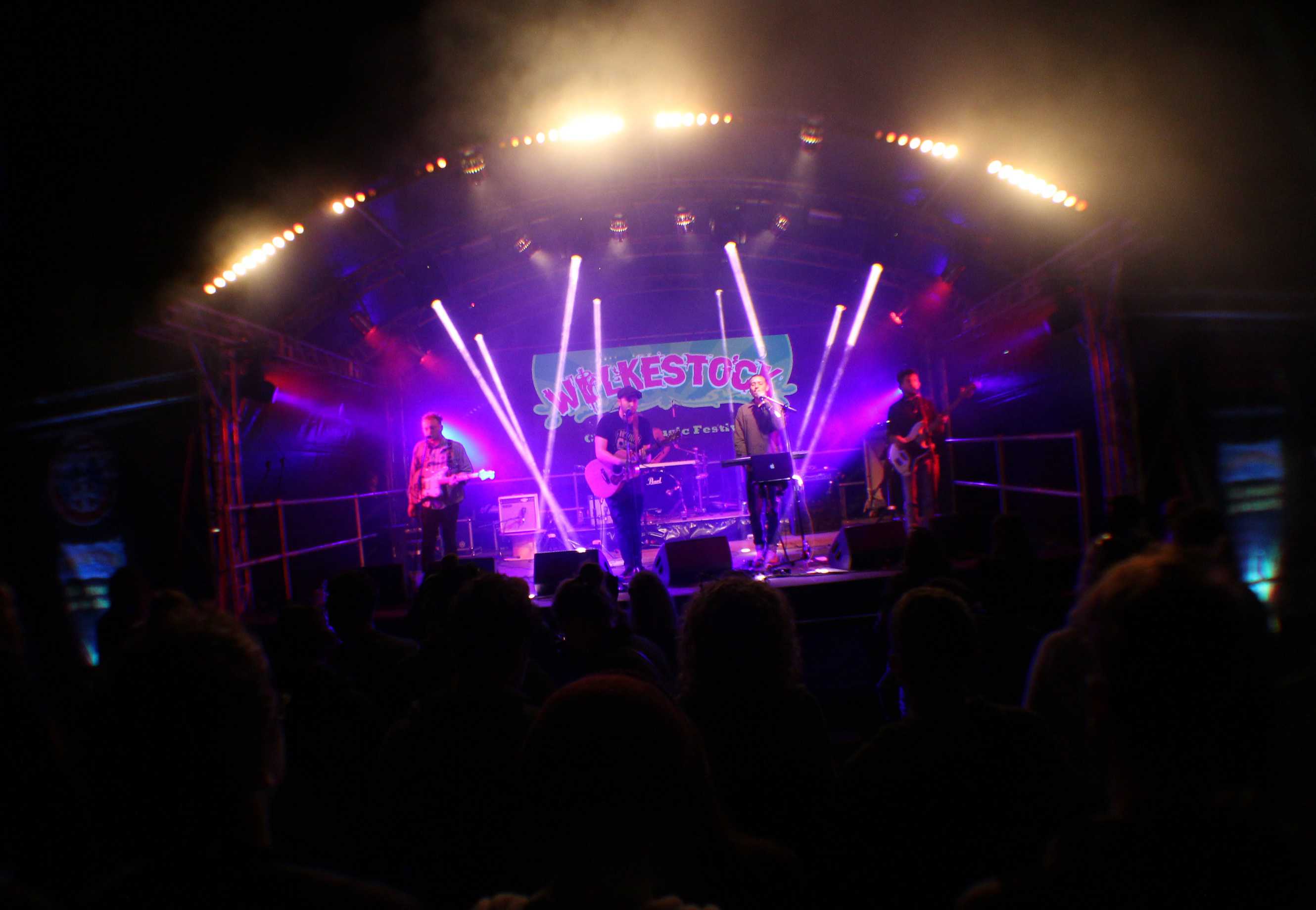 The Newest addition to the wilkestock festival, a new Heavy Duty Straw bale fortress offering fantastic containment of sound a scope for elaborate stage set up.?The Sound system installation consisted of 4 x AX88’s flown high into each corner Bass consisted of 2 x 215mk2 and 4 x BR121. The 21″ relex Bass bins offered incredibly low bottom end with minimal spill out side of the structure, Whilst the F215 mk2 bridged the gap between Sub and Top offering punchy clean upper bass, the Sound was comparable with some of the best night club installations in the world and the new structure allowed the audio level to be unaffected by offsite sound restrictions.?A challenge for video installation was set to us by Festival organiser Tom Wilkes, He projected an idea of having the entire 8′ x 8′ DJ booth built onto a Car Lift system the likes found in a Mechanics work shop, Our solution was simple a 7m wide screen made out of our Vortex 8.9mm screen with the central 2.5m attached to the car lift. This gave the screen 2 very unique looks a super wide screen in its down state and an imposing podium style look in its up position.